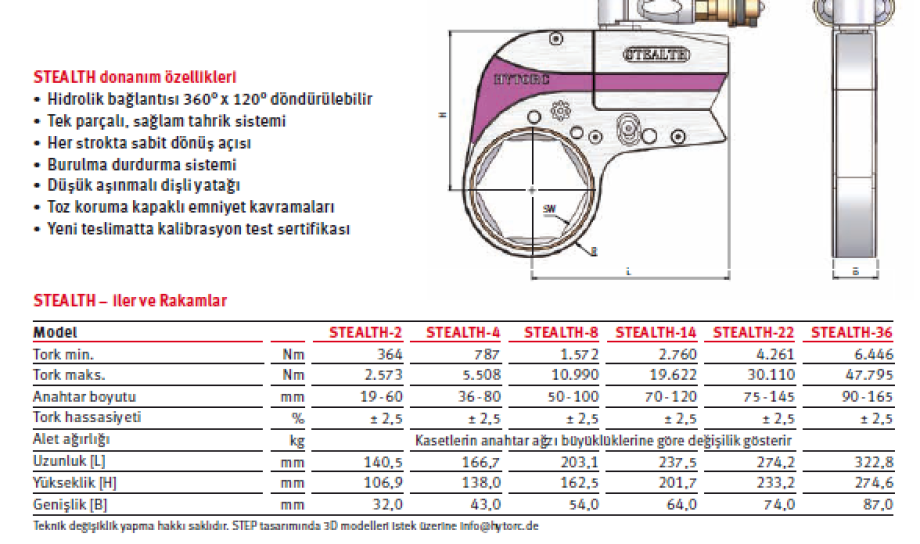 STEALTH çok fonksiyonlu ve son derece yassı bir kartuşlu tork anahtarıdır, sıkma ve gevşetme için tek bir sistem.STEALTH, süper yassı yıldız anahtar kartuşlu, çok küçük kafa yarıçaplarına ama buna rağmen yüksek torka sahip yeni ve gelecek vaat eden kartuşlu hidrolik tork anahtarıdır Tahrik sistemi, yıldız anahtar kartuşu ile eşit yüksekliğe sahiptir ve bunun dışında ayrıca cıvatalama hızını dikkate değer bir şekilde artıran bir de otomatik çift piston sistemi ile donatılmıştır. Yıldız anahtar kartuşu tek bir düğmeye basmayla temel aletin içine yerleştirilebilmektedir